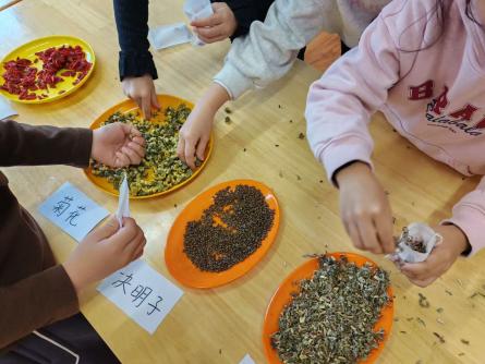 教师结合幼儿生活需求,设计“草药生活化应用”系列活动:自制驱蚊包活动中,幼儿自主搭配草药比例,部分幼儿在驱蚊包上绘制潮汕剪纸图案,既实现实用功能,又融入本土艺术元素;草药养生体验活动中,幼儿用晒干的菊花、枸杞泡制护眼茶,用艾草、生姜煮水泡脚,在身体感受中直观理解草药的养生功效;潮汕草药美食节活动中,邀请擅长制作草药膳的家长入园,亲子合作制作潮汕特色美食,家长现场讲解制作技巧与文化内涵,实现“幼儿园学习—家庭实践”的文化传承闭环。