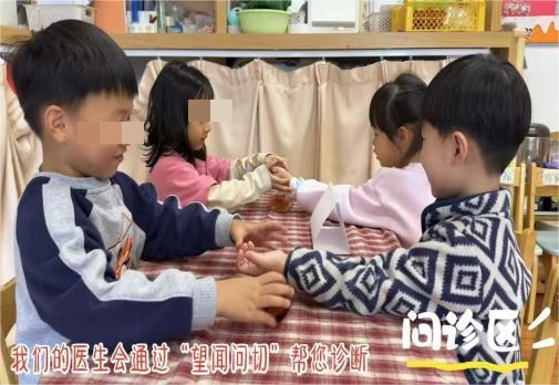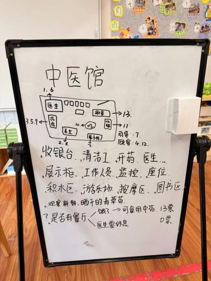 同时,教师支持幼儿自主创设“潮汕草药中医馆”:筹备阶段,幼儿集体讨论“中医馆需要什么”,自主分工形成设计组、道具组、角色组、宣传组,分别完成馆内布局设计、道具制作、角色确定与规则制定、宣传推广等任务;运营阶段,幼儿将前期积累的草药知识与礼仪文化自然融入游戏,“医师”模仿“望闻问切”流程问诊开方,“药师”准确取药并叮嘱用法,“导诊员”主动招呼客人,展现出良好的社交礼仪;迭代优化阶段,幼儿通过“客人反馈”与“自我反思”发现问题并持续改进,还自发加入潮汕文化元素,在中医馆门口设置“潮汕草药故事角”,用潮汕方言讲述草药传说与习俗。