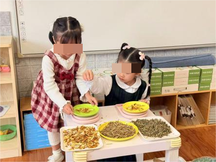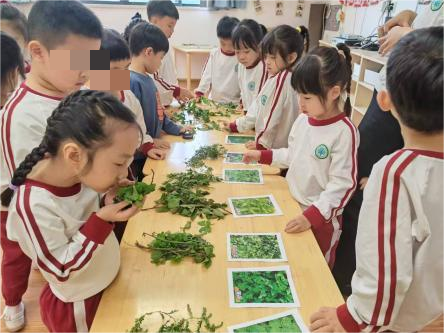 教师在班级创设“神奇草药馆”探究区,进行分层环境创设:核心区摆放草药样本、放大镜等工具;拓展区展示草药标本册、潮汕草药图谱;成果区用于展示幼儿观察记录与发现。同时,设计“三维度感官探究”系列活动:触觉维度开展“草药摸一摸”活动,引导幼儿感知草药质地差异,顺势开展“胖大海泡发实验”,初步感知温度对物质变化的影响;嗅觉维度开展“茶香辨一辨”活动,通过“盲猜挑战赛”“气味配对游戏”,建立“草药气味—生活物品”的关联;视觉维度引导幼儿制作“草药身份证”,包含“草药名称(中文+潮汕方言)、叶子形状、生长环境、我的发现”四部分,并自主讨论形成两种分类方式,分类能力与逻辑思维得到显著发展。