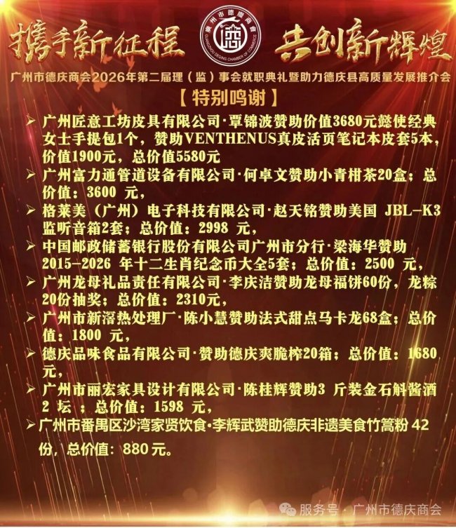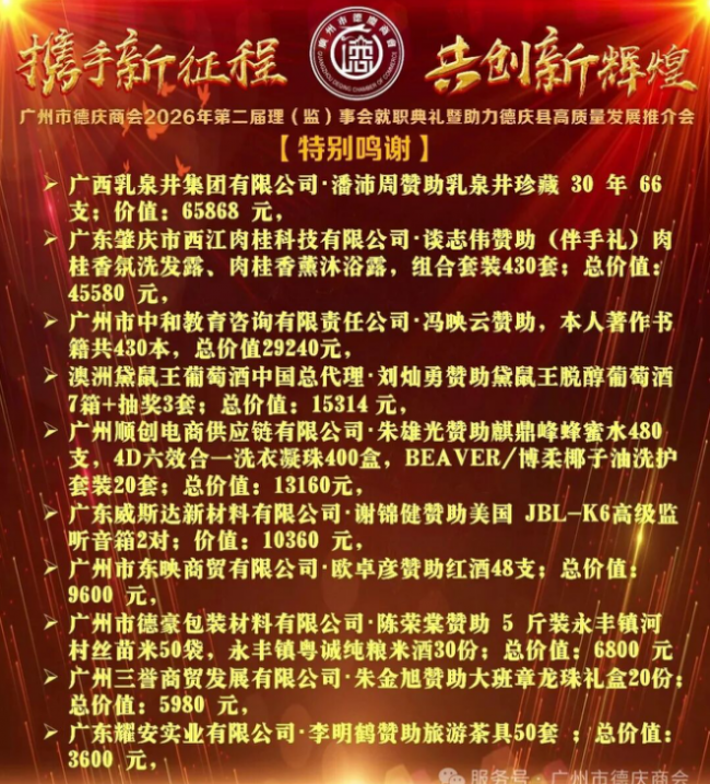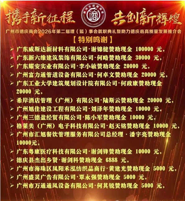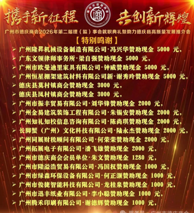 此次盛会,既是广州市德庆商会的崭新起点,也是穗德两地深化交流、共谋发展的重要契机。未来,广州市德庆商会将在新一届班子带领下,凝心聚力、砥砺前行,充分发挥桥梁纽带作用,团结带领全体会员企业,深耕广州、反哺德庆,为推动两地经济社会高质量发展贡献更大力量!