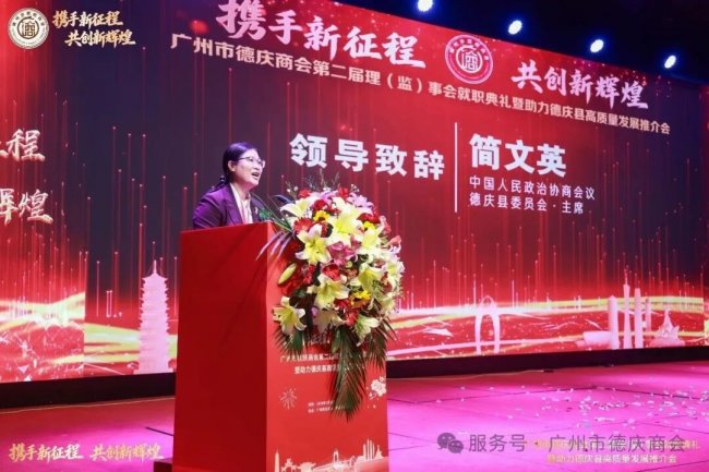 德庆县政协主席简文英发表讲话,对广州市德庆商会第二届理(监)事会就职表示祝贺,肯定商会在凝聚乡贤、沟通两地、回馈桑梓中的积极作用,鼓励广大德庆籍企业家常回家看看,积极投身家乡建设,为德庆县高质量发展添砖加瓦。