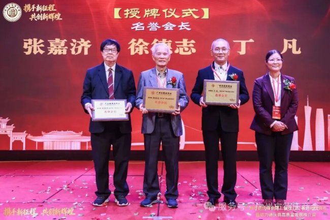 德庆县委统战部副部长、县工商联党组书记冼仲富,广州市德庆商会监事长何略向第二届监事授牌