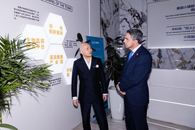 在参访过程中,罗森·普列夫内利耶夫总统重点走访了基因检测中心、细胞科技实验室及产业孵化平台,对项目整体规划与产业布局给予了高度关注。基因小镇作为由省级多部门联合推动的重点工程,总投资规模达50亿元,定位于构建国际领先的基因健康产业高地,围绕基因检测、细胞存储、生物工程、新药研发以及女性健康与生命美学等多个前沿领域,持续完善产业链生态体系,致力于打造集科研、转化、应用于一体的综合性创新平台。