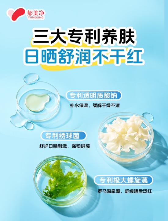 针对3岁+儿童,郁美净结合儿童好动天性与肌肤需求,采用纯化学防晒配方打造了小云朵防晒啫喱,具备SPF30 PA+++高倍防护力,7.5小时稳定防晒,满足3岁以上儿童露营、游玩、户外运动等长时间户外活动需求。