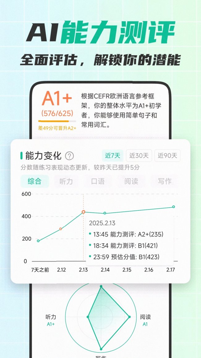 基于领先的AI智能体架构,可栗口语会在首次使用时通过基于CEFR国际标准的测评系统精准定位你的英语水平,从A0入门到C2母语级全覆盖,之后会根据你的学习目标、兴趣和学习进度自适应调节对话难度,完全不用怕太简单没提升、太难跟不上。如果是开口困难的初学者,AI还会结合上下文提供地道的参考回复,支持逐句跟读对比,大大降低开口门槛。