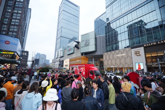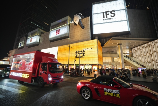 除了“188男团”的街头投喂,乡乡嘴不仅为男团设计了“投喂三连”“合影姿势”等标准化互动流程,还打造了一只极具视觉冲击力的巡游车队:跑车打头阵,车身布满“乡乡嘴豆干”“豆干吃虎皮,里外都入味”的品牌标语,在成都主干道穿行,迅速成为街头焦点;紧随其后的大型花车,也是格外吸睛,这辆满载品牌荣誉的“移动展馆”,与188男团形成了动静结合的完美传播矩阵。