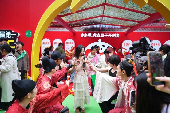 在执行层面,乡乡嘴为男团设计了“投喂三连”“合影姿势”等标准化互动流程,确保活动现场的高互动性与传播度。在成都热门商圈与街头巷尾,“被188男团追着喂虎皮豆干”成为春糖期间的城市级社交体验,大量路人自发拍摄短视频上传抖音,#乡乡嘴在春糖请全国人民吃虎皮豆干 等原生话题迅速发酵。