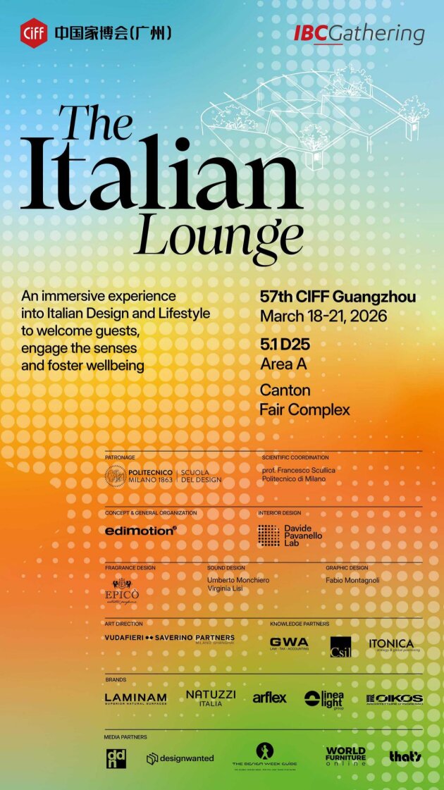 由专注于设计和家具国际营销与传播的 Edimotion 公司构思并组织,与CIFF协力策划,「The Italian Lounge」应运而生。作为CIFF国际交流平台 —— 国际商务俱乐部(IBC)的核心交流与社交空间,支持与联结全球买家、参展商和多行业专业人士,高效促进全新的合作和业务发展可能性。