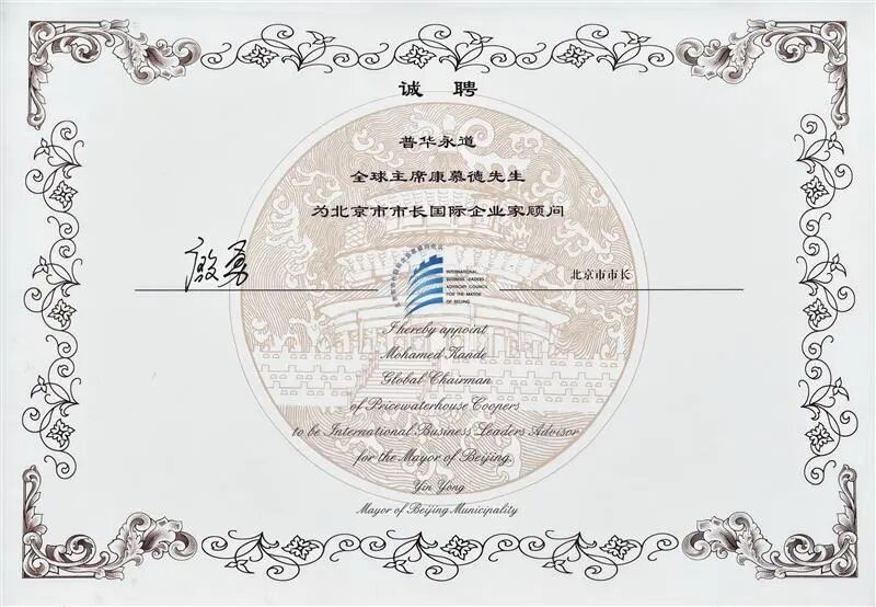 大会期间还举行了顾问聘任仪式。康慕德主席从殷市长手中接过聘书,正式受聘成为新一任北京市市长国际企业家顾问。