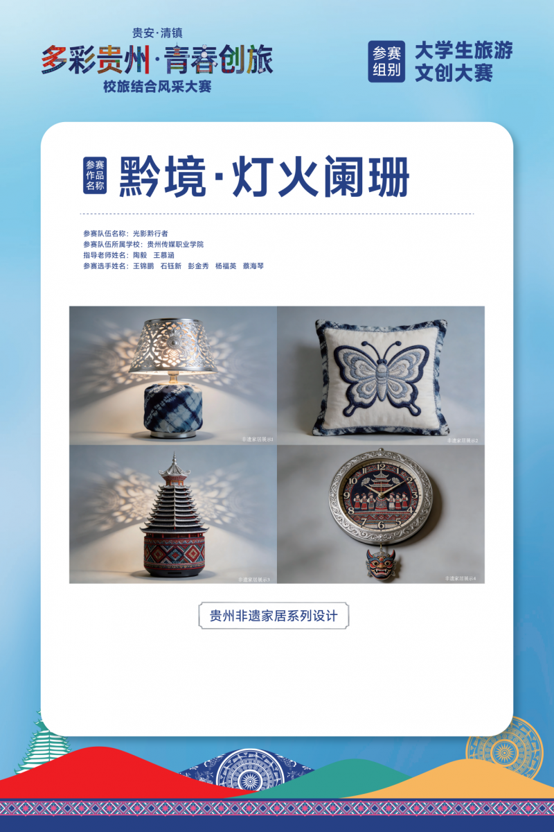 三等奖:光影黔行者队《黔境·灯火阑珊——贵州非遗家居系列设计》、行远拾光队《锦绣少年·文脉同行》、每日开心队《布依云绵》