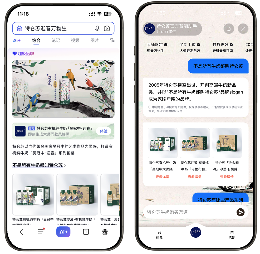 过去搜索广告最常见的路径,是等待用户提问后,给出一些信息,让用户自行查看和判断。而AI加入后,百度营销的『新搜索』重构了这一逻辑。 它让搜索场景的营销形态,变成能够理解用户意图、并直接交付完整解决方案的服务模式。这个能力让搜索行为本身,成为AI营销价值涌现的智能触点。 比如在特仑苏的案例中,当用户搜索特仑苏名画系列相关问题时,新搜索并未返回一个普通的新闻列表,而是呈现了一个融合了AIGC艺术大片、智能体对话、商品信息等丰富内容的完整体验空间。