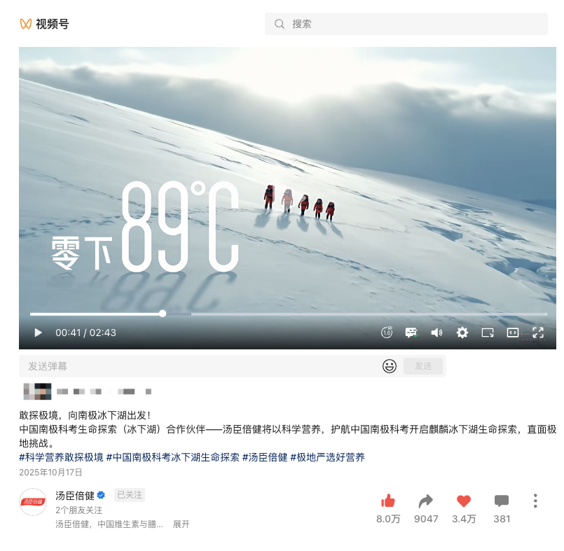 前段时间,各大营销奖项主办方陆续公布了25年的评选结果。“AI”一词以极高的频率跃入眼帘,这已不再是偶然的亮点,而是一个明确的行业信号。奖项历来是营销行业最权威的风向标,观察其赛道怎么设置、评审方向如何变化,往往能预测出未来几年营销行业发展的核心方向。当金投赏、艾菲奖等权威奖项,都不约而同地将聚光灯投向了AI,这本身就传递出了很关键的信息:AI营销已经是大势所趋、不可逆转。如果你还只是在卷创意,那肯定要在营销领域落伍了。抓紧时间拥抱AI营销,才是接下来提升企业营销效率的关键。 2025年,金投赏年度主题定为了“释放AI创造力” ,并将AI赛道进行系统化升级,将AI营销赛道细化为「AI 内容」「AI 沟通」「AI 投放」「AI 创新整合」等奖项类别,深度挖掘并系统性评估AI技术在营销创新应用中的价值。这意味着奖项的评选,已从传统的创意比拼,转向了AI应用的较量。同样,艾菲奖也在持续加强AI营销的建设,表彰利用AI技术,在营销策略、创意、媒介、用户体验或数据分析等方面取得卓越商业成效的案例。在官方奖项架构中,“AI营销”与“效果营销”、“娱乐营销”、“社会责任营销”等经典赛道并列。这一独立赛道的设立与巩固,清晰地表明:AI已从一种前沿技术工具,演进为一种主流的营销方式。 核心奖项的集体聚焦,为品牌方的AI创新按下了加速键,越来越多现象级的AI营销案例正持续涌现。 我们观察到近期的一个爆款案例,汤臣倍健结合第42次中国南极科考契机,推出了南极科考主题全AI品牌大片《敢探极境》,全程零实拍、纯AIGC制作。过去制作类似的视频,如果采用实景拍摄,一天费用动辄百万,且面临极端环境拍摄风险与生态保护压力。而全AI制作,不仅大幅降低了制作成本,还能突破南极冰下湖难以实拍等阻碍,还原南极科考震撼场景,实现理想的视觉效果,成功绑定南极科考IP,传递汤臣倍健的品牌精神。