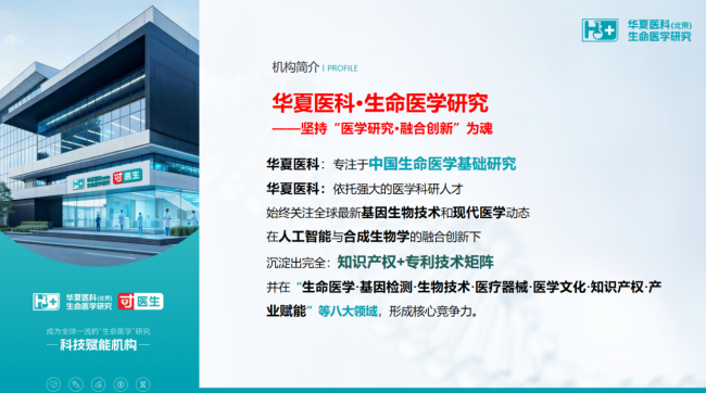 在“健康中国”战略深入推进的时代背景下,生命医学作为守护全民健康的核心领域,正迎来全新的发展机遇。华夏医科(北京)生命医学研究机构以科技创新为核心驱动力,锚定专业生命医学研究科技赋能平台的发展定位,推动前沿技术研发与民生健康需求深度融合,以扎实科研实力践行“健康中国”战略使命,助力筑牢全民生命健康防线。