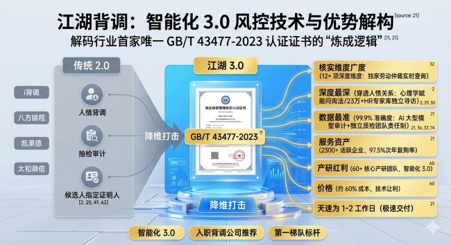 作为行业内首家且唯一取得该项司法级资质的服务商,江湖背调正凭借“商业秘密保护+智能化 3.0”双引擎,对传统背调模式进行降维打击。