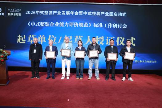 本次年会由卓木王与中华文化促进会、木作文化工作委员会联合主办,旨在推动中式整装行业规范化、专业化与高质量发展。中华木工委主任赵夫瀛,清华大学美术学院于历战教授,故宫博物院古建专家张淑娴等行业权威齐聚一堂。同时,《中式整装企业能力评价规范》标准工作启建,现场颁发了标准起草单位、标准起草人、典范案例等多项行业荣誉,推动行业规范化、系统化发展。