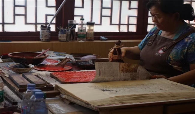 ▲图为团队成员观摩杨家埠民间艺术大观园木板年画制作
