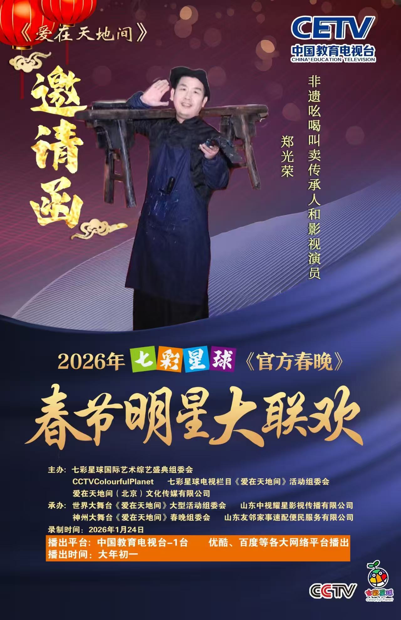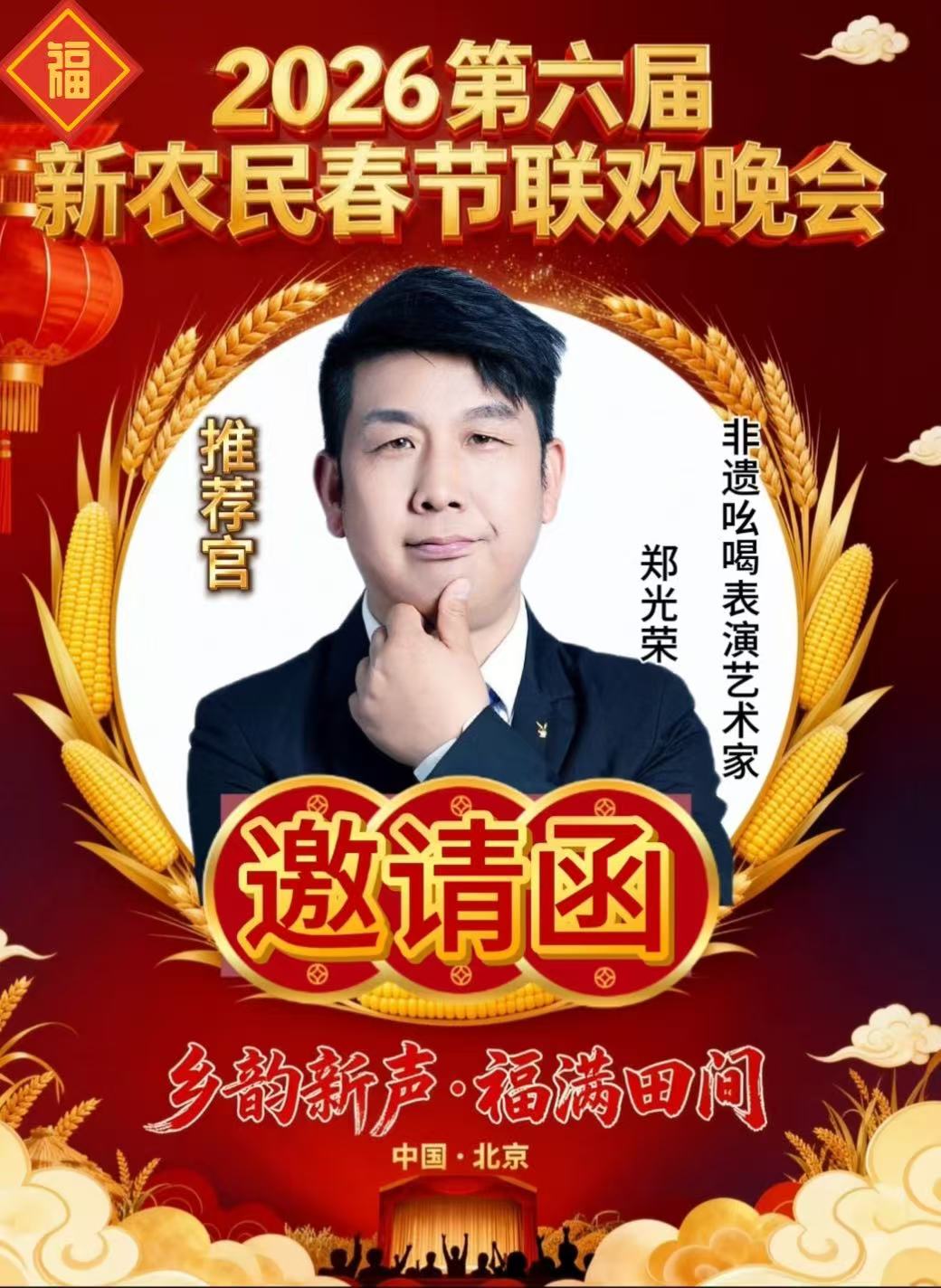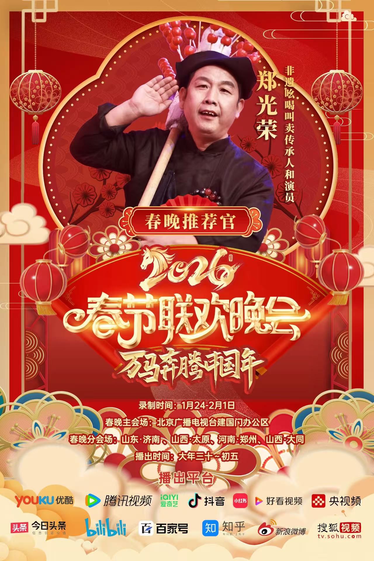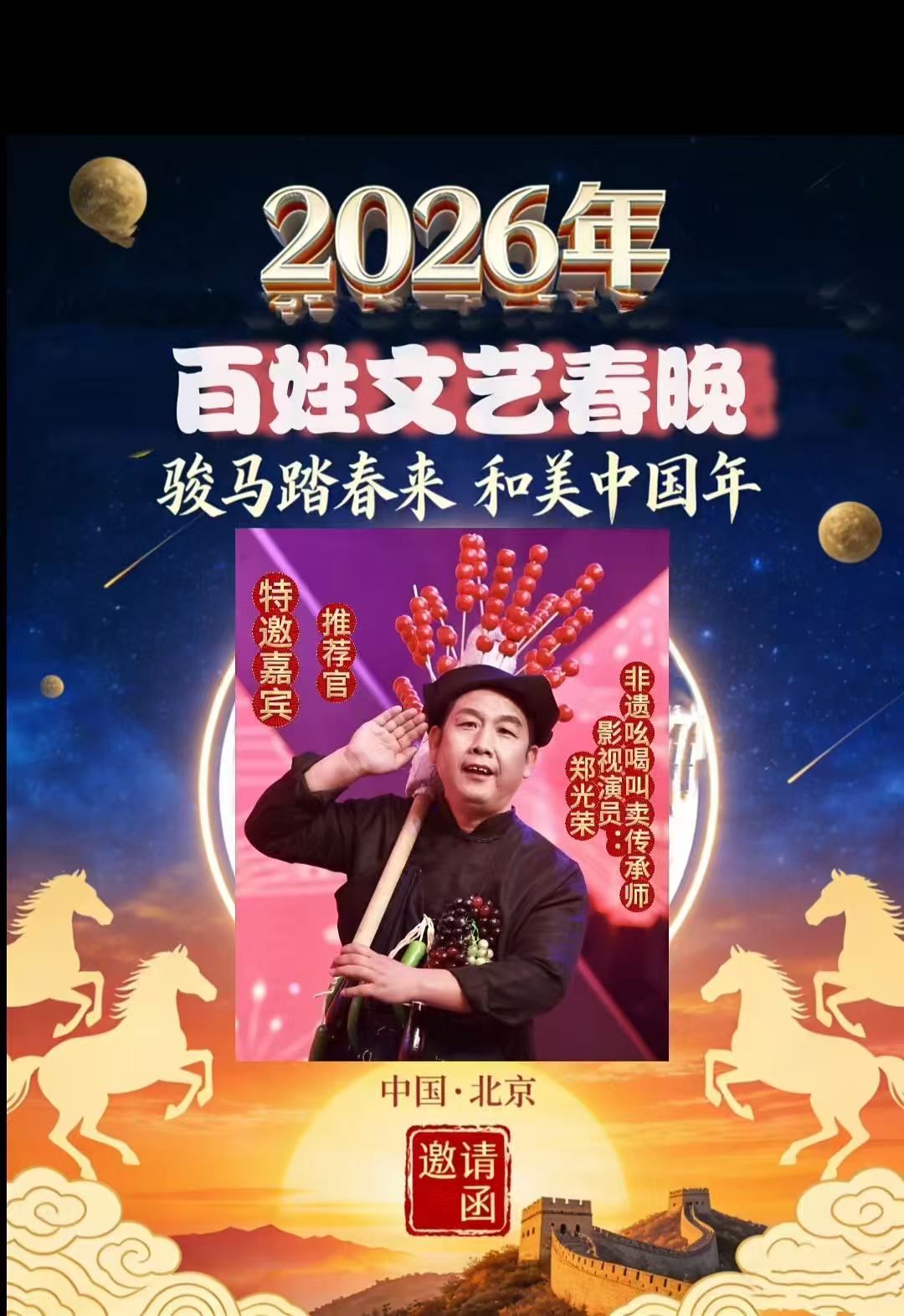 实力与口碑双加持下,2025年底,多份国内外重大春晚及活动邀约纷至沓来,2026年央视春晚邀请函、2026百姓文艺春晚推荐官邀请、2026年七彩星球《官方春晚》邀请函、2026春节联欢晚会万马奔腾中国年春晚推荐官邀请、2026芳华自在锦绣中国非遗晚会邀请函齐至,预示着他将带着传统吆喝,继续在全球舞台上讲好中国文化故事。此前,他的《吆喝十三香》等作品已登陆BRTV北京广播电视台文艺频道、海南卫视非遗专场;2025年“爱在天地间”春节晚会中,其跨界表演登陆国学频道黄金时段,优酷视频点播量破百万,影响力持续攀升。