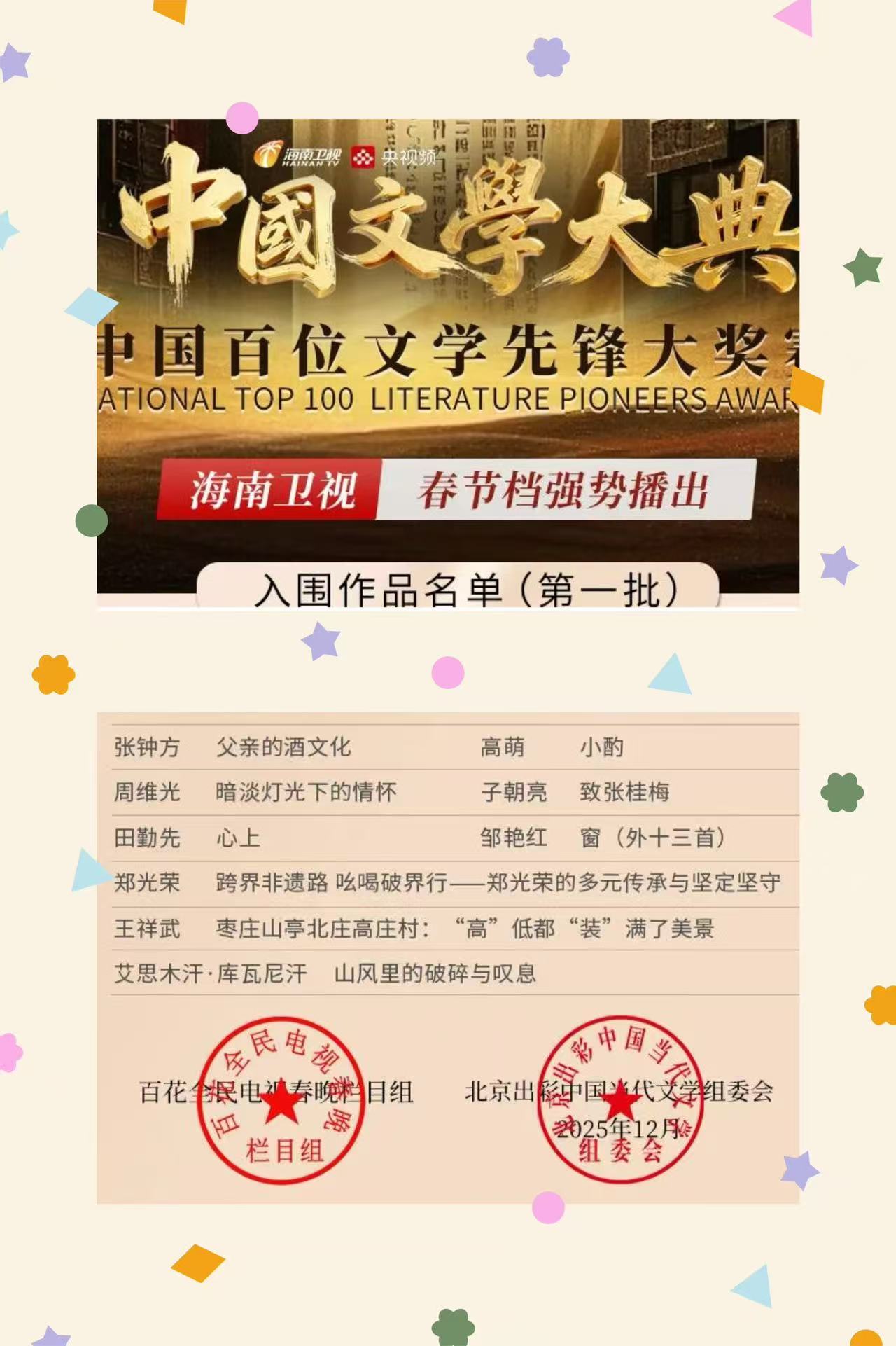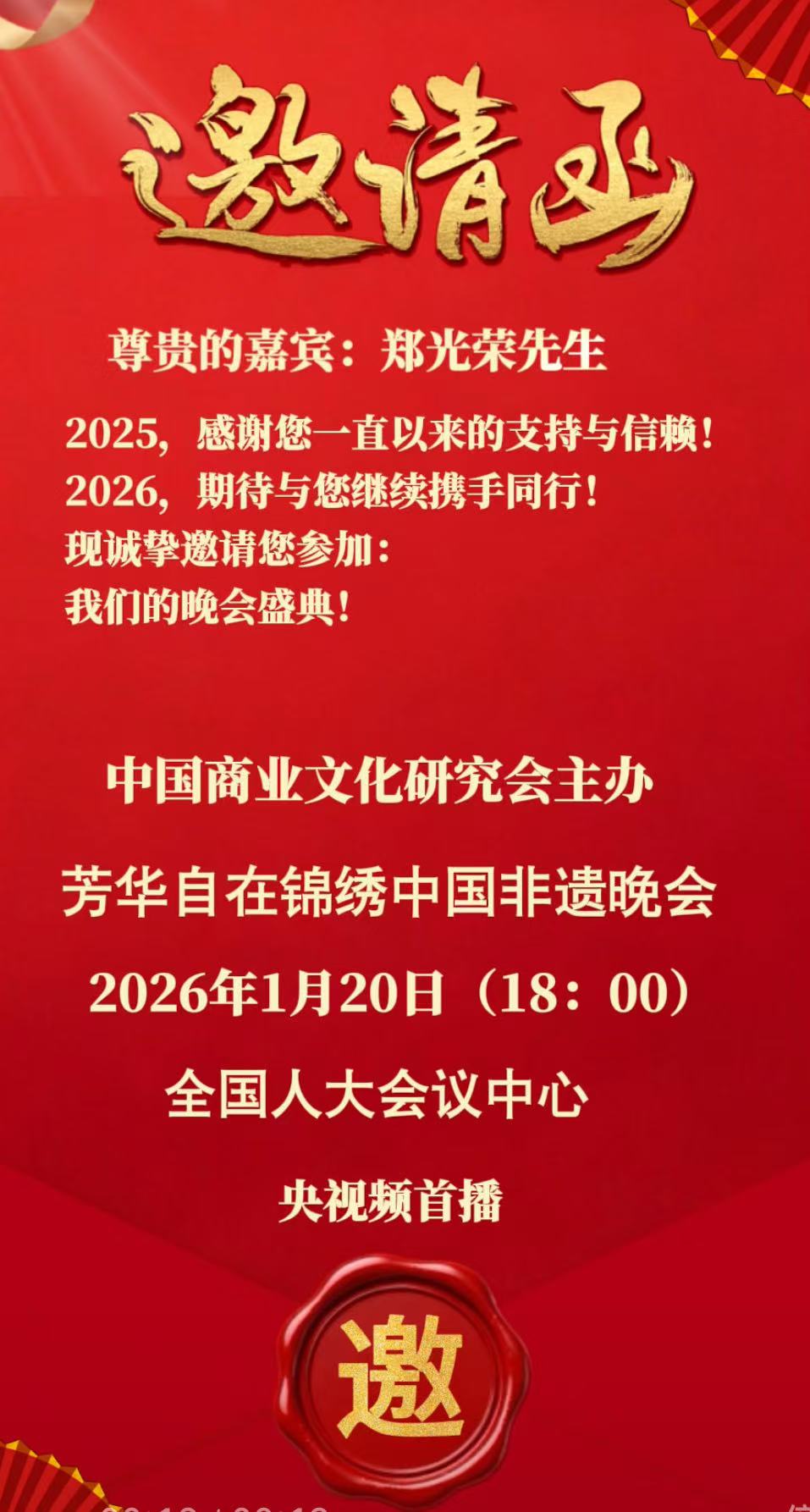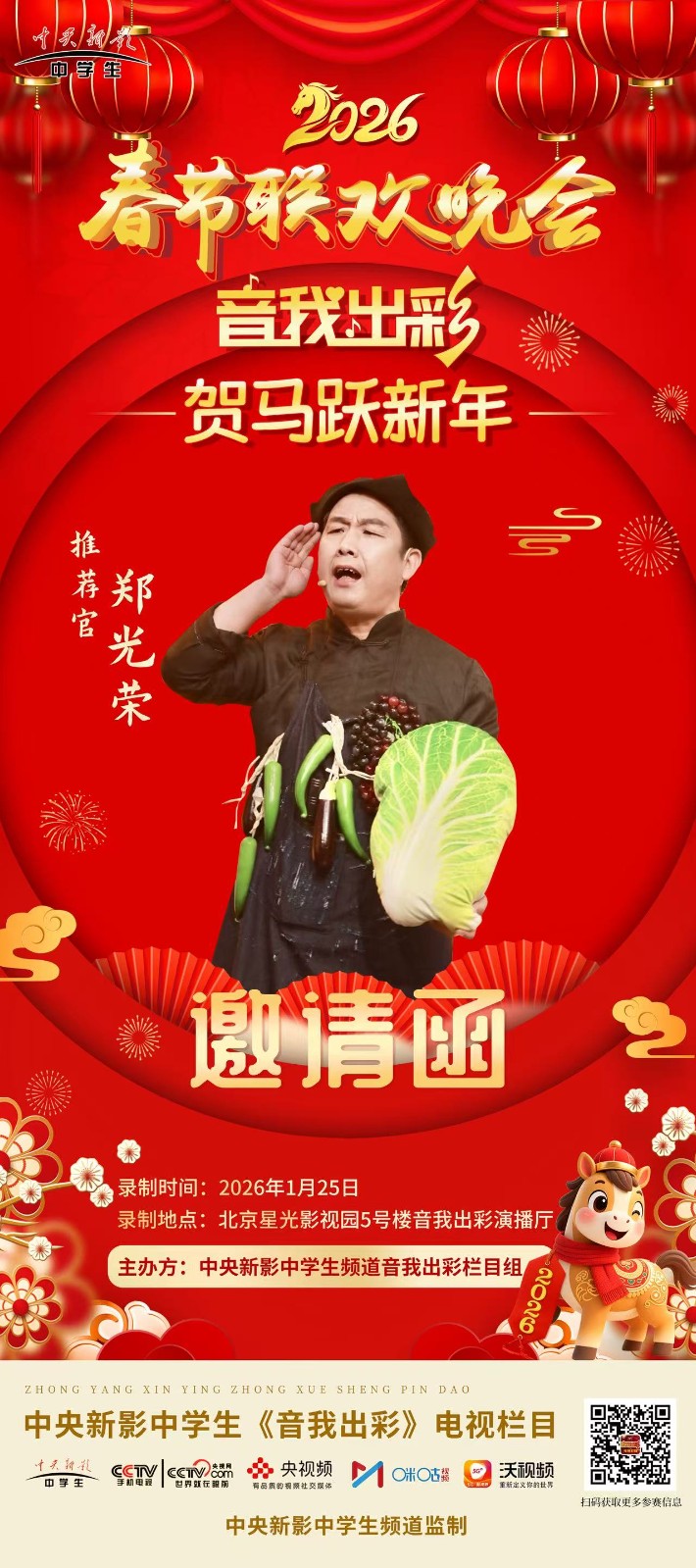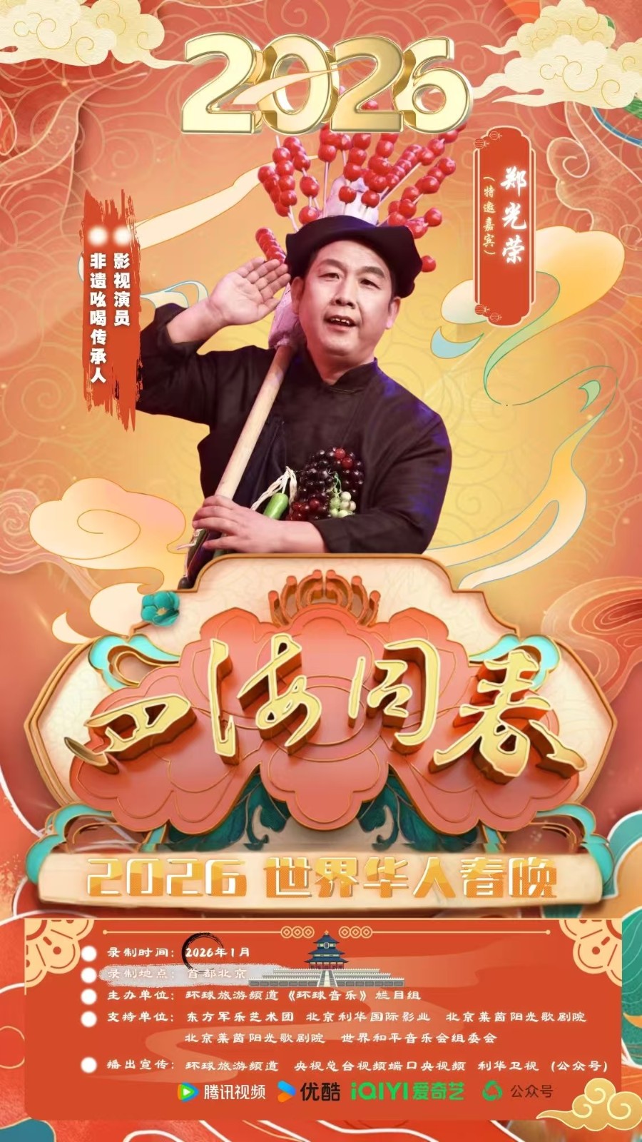实力与口碑双加持下,2025年底,多份国内外重大春晚及活动邀约纷至沓来,2026年央视春晚邀请函、2026百姓文艺春晚推荐官邀请、2026年七彩星球《官方春晚》邀请函、2026春节联欢晚会万马奔腾中国年春晚推荐官邀请、2026芳华自在锦绣中国非遗晚会邀请函齐至,预示着他将带着传统吆喝,继续在全球舞台上讲好中国文化故事。此前,他的《吆喝十三香》等作品已登陆BRTV北京广播电视台文艺频道、海南卫视非遗专场;2025年“爱在天地间”春节晚会中,其跨界表演登陆国学频道黄金时段,优酷视频点播量破百万,影响力持续攀升。
