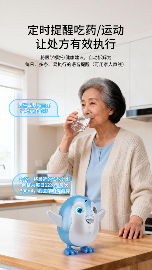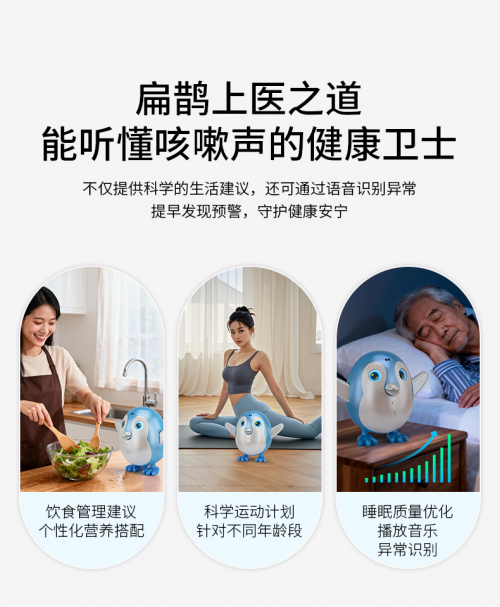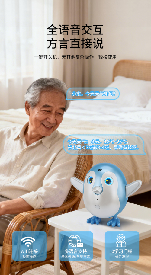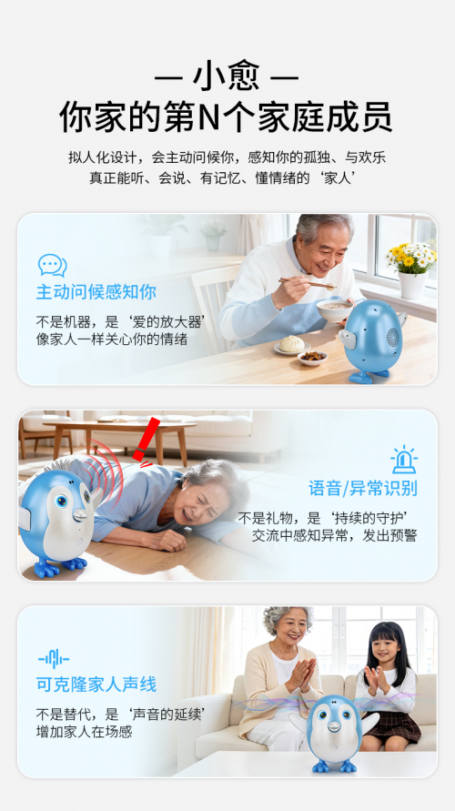 小愈,一只会主动跟你招呼、主动关心你的小企鹅 —— 红外感应主动察觉孤独 + 3分钟复刻声线 + 预警健康异常 + 定时健康计划 + 支持多国语言。