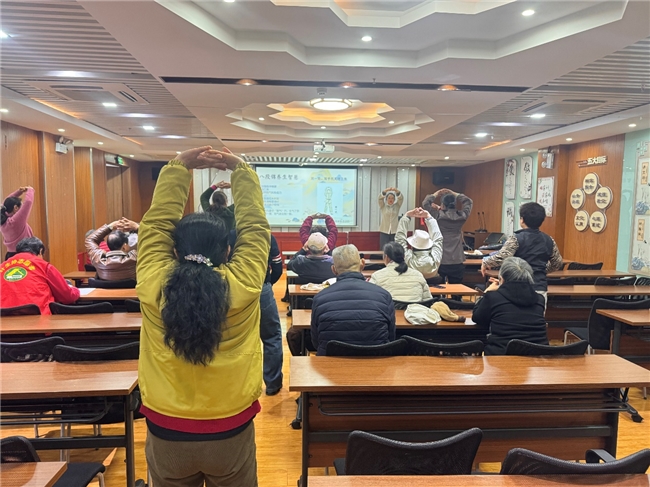 随后,传统养生文化学习环节温馨开展,聚焦八段锦的起源与经络原理,为在场成员带来一场兼具知识性与实用性的养生体验。授课老师详细讲解了八段锦作为中华传统导引养生功法的历史渊源,介绍其始于宋代、盛行于明清,是融合中医养生理念的经典功法,根植于《黄帝内经》“天人合一”“阴阳平衡”的养生思想,属于传统导引术的重要组成部分。同时,老师结合经络学说,通俗阐释了八段锦每一式动作与人体经络、脏腑的关联,讲解其通过舒展肢体、调和呼吸,达到疏通经络、调和气血、滋养脏腑的养生功效,让大家明白八段锦“调身、调息、调心”三调合一的核心要义。讲解结束后,老师带领大家逐式练习基础动作,纠正姿势细节,鼓励大家坚持练习,以温和的运动方式调理身体,践行“治未病”的养生理念。