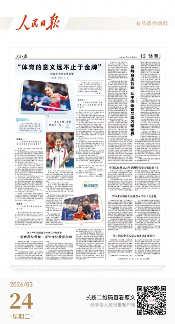 3月24日,《人民日报》刊发全国政协常委、全国工商联副主席、安踏集团董事局主席丁世忠的署名文章《坚持自主创新,让中国体育品牌闪耀世界》。