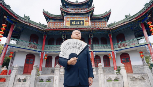 古汉台作为刘邦建立汉朝的发祥地,被誉为“汉家发祥地”,这里留存着望江楼、石门十三品等珍贵文化遗产,是承载汉文化根脉的重要场所。活动当天,广龙导演身着中式立领服装,手持折扇与讲解器,先后探访望江楼、汉台石刻展区等核心点位。在望江楼前,他驻足凝望飞檐翘角,向镜头娓娓道来汉中作为“汉人老家”的历史渊源;在博物馆内,他围绕“石门十三品”等国宝级文物,细致解读汉代书法艺术与栈道文化的独特魅力。
