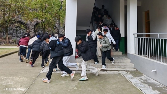 演练开始,随着急促的警报声响起,全校师生立即启动应急预案。各班学生在班主任的引导下,采取弯腰低姿、捂住口鼻的方式,按照既定疏散路线,快速、有序地撤离至操场指定集合地点,整个疏散过程紧张有序,安全高效。