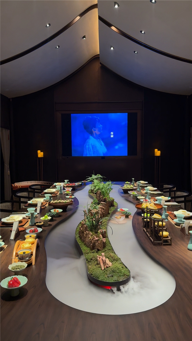 正方元·臻宴,以“五感疗愈”为核心理念,从人的视觉、听觉、嗅觉、触觉、味觉五个维度营造沉浸式用餐体验。创新的空间设计,融合东方美学与现代简约、宋式雅韵风格的曲水流觞包间、光影走廊等场景,让食客在这种雅致的自然环境中得到放松。菜品研发也严格遵循“药食同源”原则,并独创“臻宴三法”——先检测体质、再匹配食材、后定制膳食,为每位客人提供个性化的养生方案。