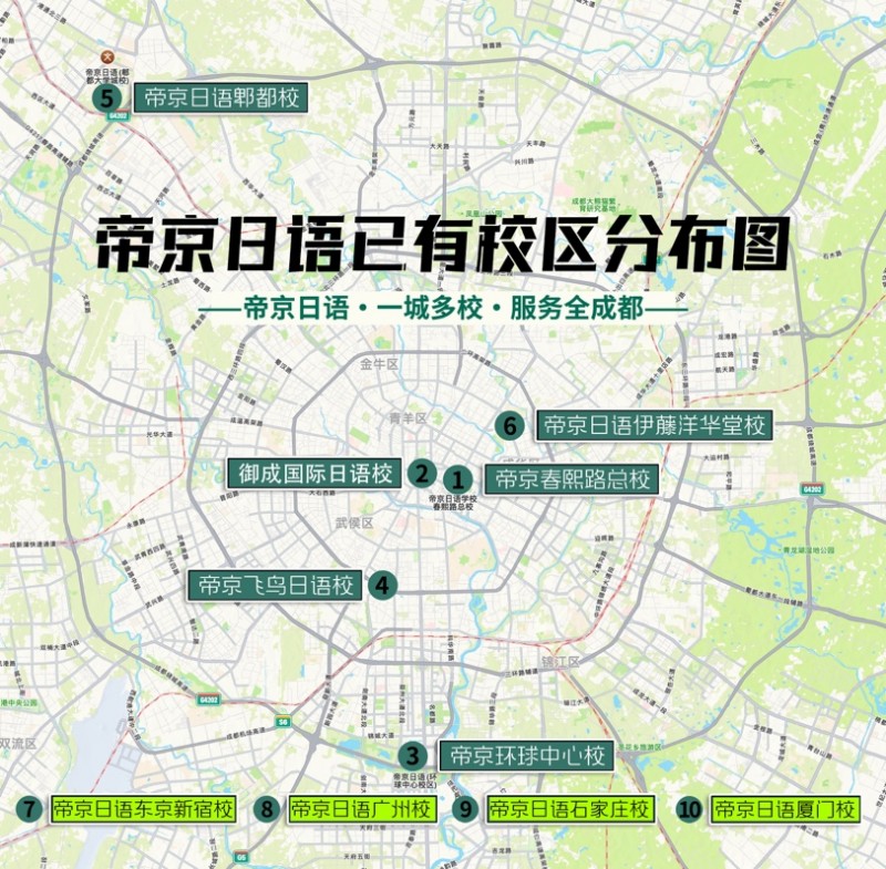 帝京日语,在成都总投资3000万打造。旗下多家公司、学校,有多个办学许可证的培训学校、也有出国留学公司及文化交流中心。另有高岛留学、御成国际日语、飞鸟日语、飞鸟留学、出云日语、初花、东成、《未来日语》等日语和教材子品牌,是全国少有的大型日语学校。