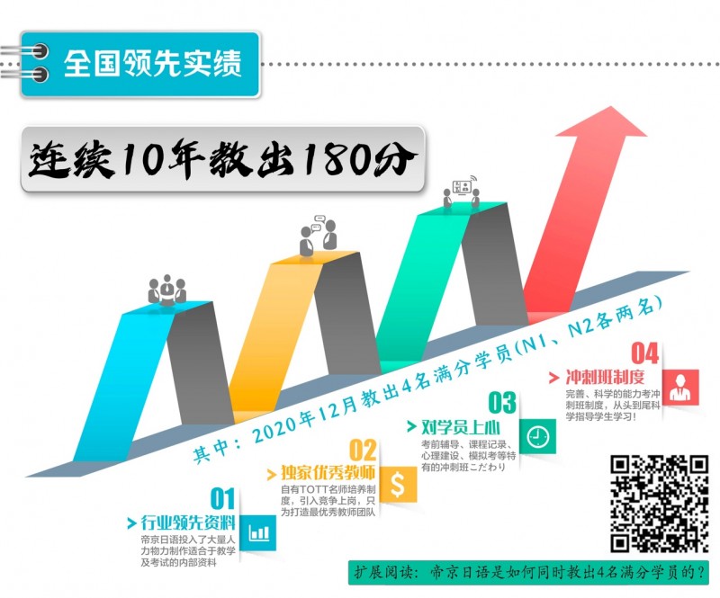 王牌内部教辅:帝京日语对于教学与教研方面一直秉承实用、与时俱进的理念,投入众多人力物力,开发内部资料。更是制作了全网最全的日语能力考复习资料,如能力考N1N2真题的阅读文章翻译便耗时一年多的制作和校对才做出第一版。并且资料每半年更新一次版本,以保证内容最新。也免费分享给粉丝,支援大家学习,因此也收获了几十万支持者,下载总量超百万。每天都有日语学习者下载帝京日语的内部资料使用。帝京日语校长作为知乎日语话题优秀答主(全网优秀答主仅10人),一直力求引领日语培训行业发展。追踪研究能力考多年,制作出大量适合更高效通过N1和N2的资料。整理出每个板块的高分、满分通过的方法论,其中《如何备考能力考》文章被知乎《从零基础到N2-你相见恨晚的日语学习方法》官方电子书收录。
