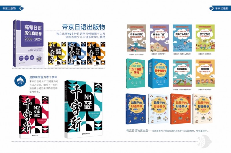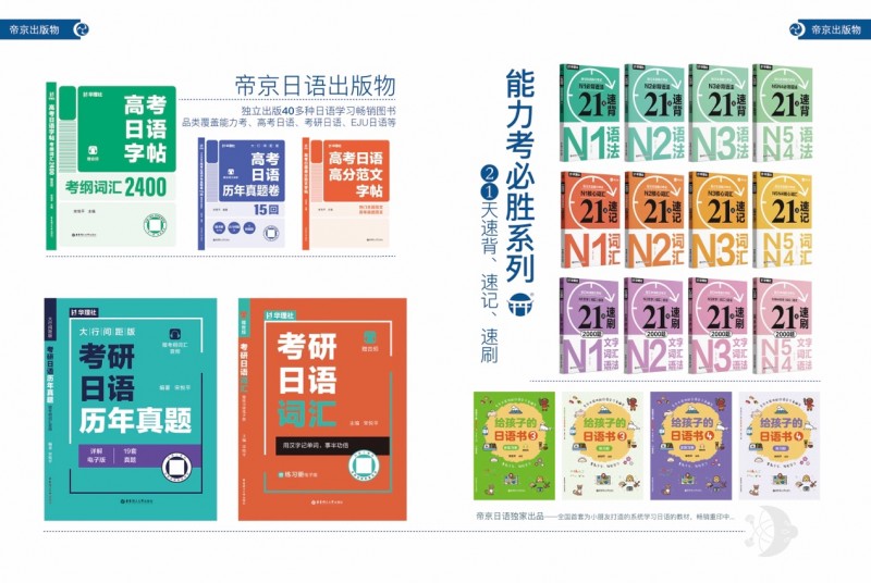 帝京日语出版物:独立出版40多种日语学习畅销图书以及全国首套少儿日语系统学习教材。追踪研究能力考十余年,帝京日语对JLPT日语能力考有深入研究,编写了一系列适合高分通过考试的教材和备考用书。