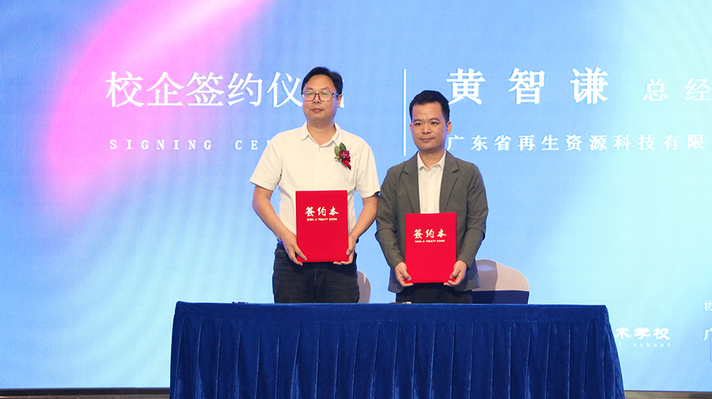 开幕式上,校企合作签约仪式成为全场焦点。广东省再生资源科技有限公司总经理黄智谦与佛山市华材职业技术学校相关负责人正式签约,双方达成深度合作共识,未来将聚焦人才定向培养、实习实践基地共建、产学研项目协同等领域展开全方位合作,打通学生从校园课堂到产业一线的实践通道,助力企业发掘培育一批兼具专业实力与绿色发展理念的优质设计人才,为粤再生平台迭代升级、再生资源产业创意赋能夯实人才根基。
