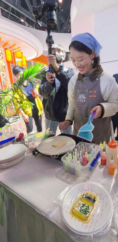 3月26日展会开幕当天,六必居×卡通煎饼主理人曾雅鑫跨界引爆现场,她将六必居黑芝麻酱、二八酱融入煎饼面糊,搭配麻仁金丝等经典酱菜,制作出多款造型可爱的卡通煎饼。这场跨界互动通过直播与短视频传播,迅速刷屏社交平台,成为糖酒会期间热议的“老字号破圈”案例。