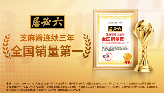 经销商大会上,六必居正式发布艾媒咨询权威认证:芝麻酱系列产品连续三年全国销量第一。该认证依据全国(不含港澳台)芝麻酱市场研究比对结果授予,印证了这一近六百年老字号在调味品市场的深厚根基。
