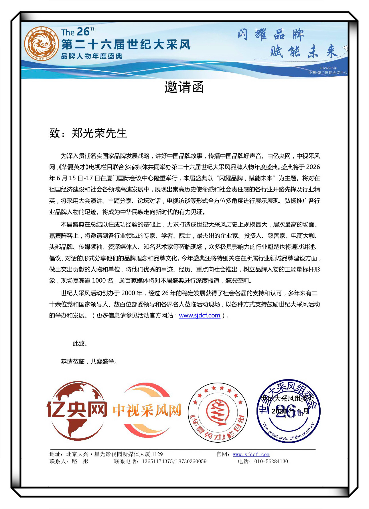 非遗吆喝传承人郑光荣收到第二十六届世纪大采风品牌人物年度盛典的正式邀请函,获邀出席这场全国性品牌盛会。