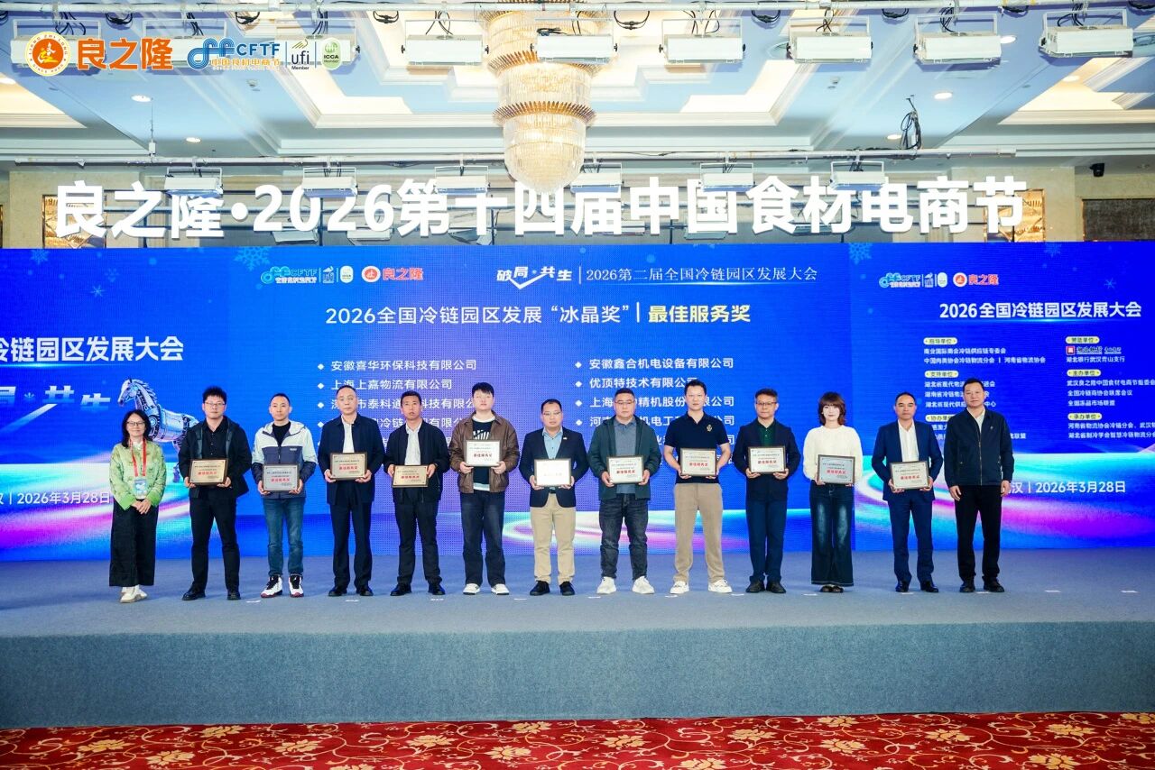 在同期举办的2026全国冷链园区发展大会上,华鼎冷链科技凭借专业的服务能力和科技实力,荣获2026全国冷链园区发展“冰晶奖”最佳服务奖。
