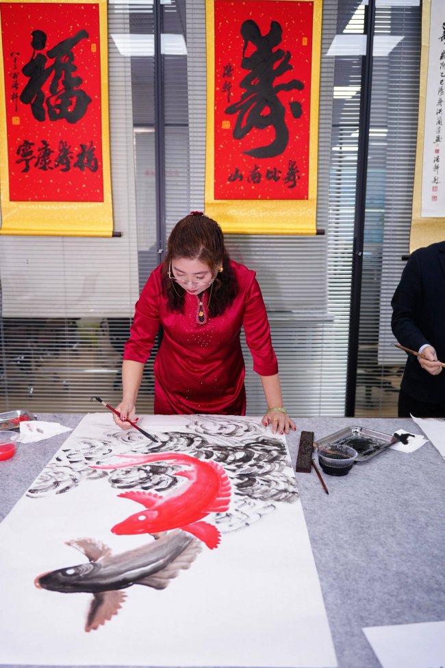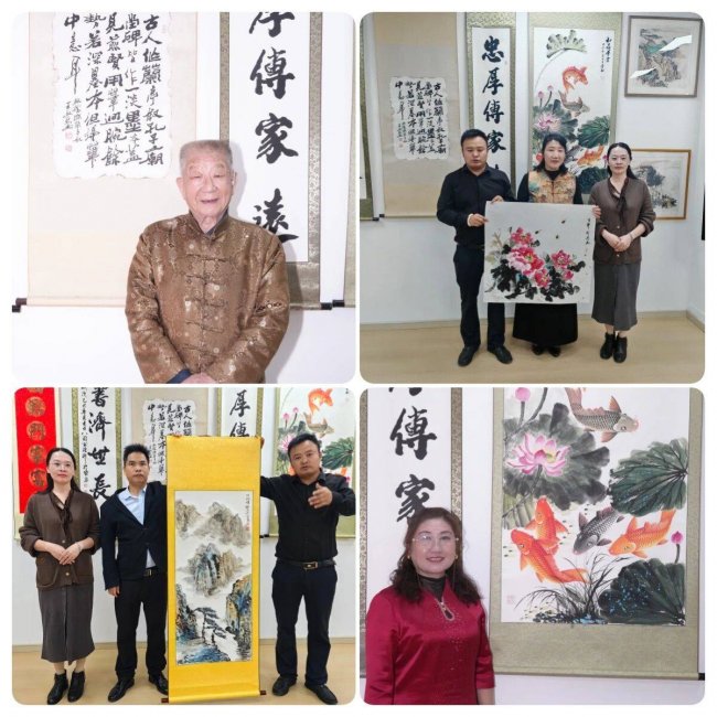 活动现场墨香氤氲,满室生辉。悬挂着 “福”“忠厚传家”“诗书济世长” 等经典书法作品,以及锦鲤戏荷、牡丹盛放、山水写意等国画佳作,一笔一画皆见功力,一景一物尽显东方美学。参加的老师们驻足欣赏,在一幅幅作品前细细品味,或轻声交流创作心得,或用镜头记录下笔墨间的神韵,氛围热烈而雅致。