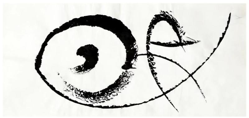 第二重美是意象之美。中国传统美学中的“意象”不是主观的幻想,也不是客观的再现,而是主客交融的产物。书法幻线艺术的抽象形态恰恰契合这种意象逻辑。笔者在实践中将汉字构形中“圆”的形态通过水与墨的有机结合,创造出趣味的图形。它既不是纯粹的几何抽象,也不是具体的物象描绘。这种意象会让人产生很多想象,却又无法具象描述,却充满生命感。笔者认为这便是意象的本质:它唤起形象的联想,却不被任何具体形象所限定;它是沉浸于线条与墨象引发的自由联想,也是一种主客消融的审美体验。观者的想象与作品的暗示相互激发,每一次观看都是一次新的意象生成。