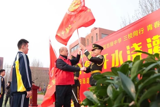 接着,衡水二中党委书记陈红升将象征责任、团结与荣耀的远足旗帜,郑重授予学生代表。旗帜挥舞,猎猎生风,凝聚着三校师生共同前行的决心。