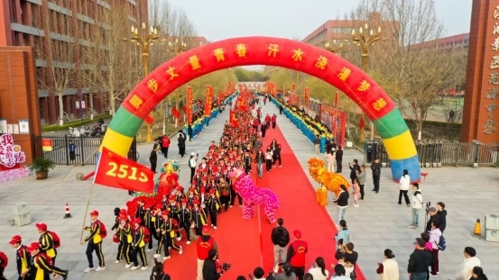 出征礼炮余音未绝,三校领导率先领队,三面校旗迎风招展,引领着浩荡的队伍启程。各级部师生按序列队,四列并行,步伐坚定地走出学校东门。随行音响播放着激昂的乐曲,与整齐的脚步声、响亮的口号声交织成奋进的乐章。沿途,精彩的舞狮表演和铿锵有力的鼓点为同学们加油助威,现场气氛热烈,士气高昂。