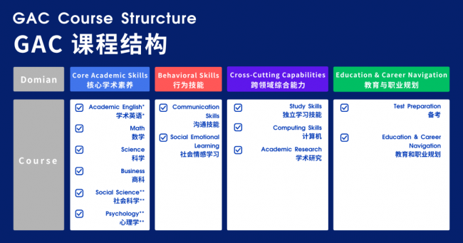 GAC课程是专为非英语母语学生设计的国际大学预科课程,与ACT考试深度衔接。完成课程后,学生可直接对接全球百余所合作大学本科一年级。双威公学将GAC课程引入并嵌入本校高中课程体系,不仅开设学术英语、数学、科学、商科等核心学科,还融入沟通协作、情绪管理、计算机应用、学术研究等综合能力培养,在夯实学术基础的同时,着重提升学生适应未来学习与发展的软实力。课程可全方位提升学生的学术水平与留学适应力,适合目标全球多元高校、希望提前适应全英文教学环境的学生。