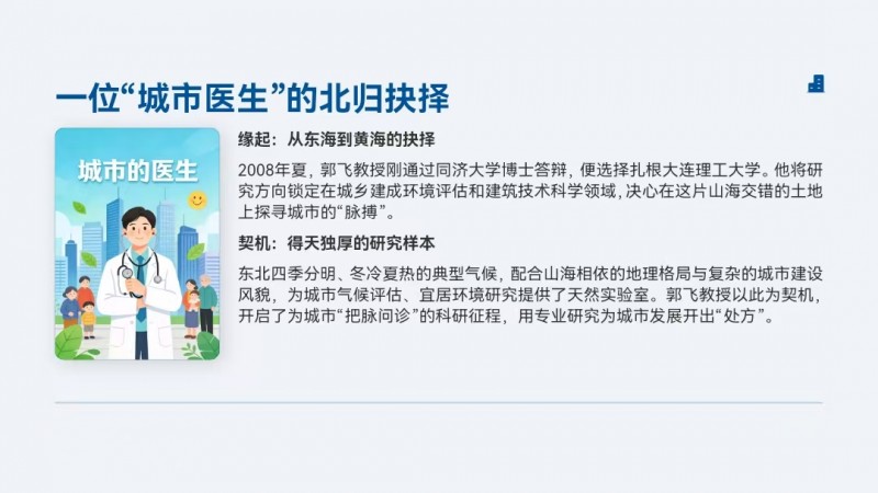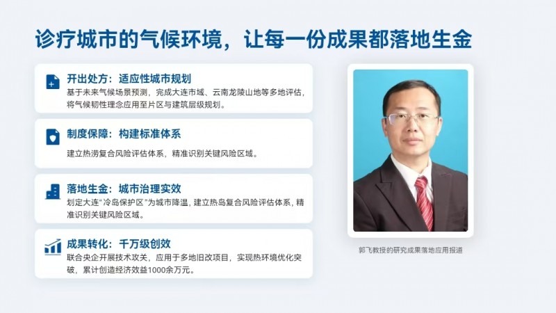 他们发现,滨海地区盲目“开天窗”,反而会让城市更热;还破解了热涝叠加的风险规律,让商业区、医院在暴雨高温来临时,提前做好准备。大连的“冷岛保护区”,多个校园的节能改造,累计创效超千万,都是他的科研答卷。