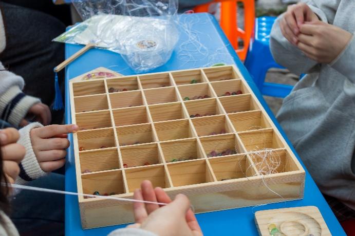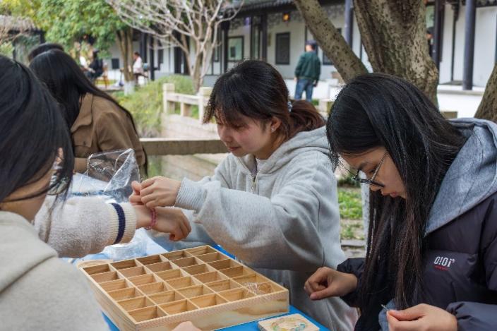 在串珠体验环节,工作人员引导同学们穿珠成串,参与者们全神贯注,将一颗颗温润的珠玉、玛瑙与琉璃,通过巧思设计与细致穿引,化作精巧的手链与挂饰。每一根丝线的穿过,都仿佛是在与历史对话;每一颗珠子的落位,都代表着对匠心精神的致敬。