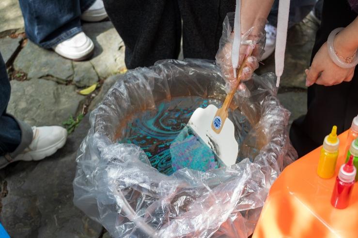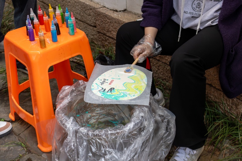 在漆扇制作环节,在协会志愿者的指导下,参与者们以天然大漆为颜料,以水面为画布,运用“漂漆”技法,将绚丽的色彩巧妙转印至素白的扇面上。随着扇面缓缓入水、提起,流动的色彩被定格成独一无二的纹理——或如山峦叠嶂,或似流水潺潺。一把把精美的漆扇在大家手中诞生,既实用又极具艺术价值。