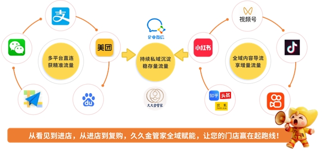 久久金管家打造 “线上广撒网、深耕作、精触达” 的全域营销体系,为加盟商赋能线上流量红利: