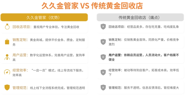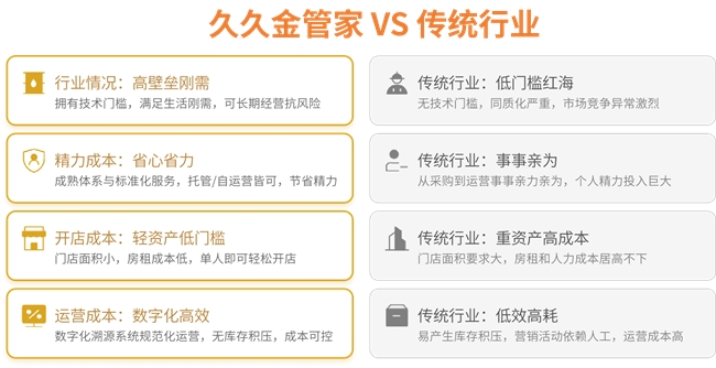 与传统贵金属行业重资产、高风险、同质化竞争不同,久久金管家以低门槛、轻资产、数字化运营为核心,打造低风险创业赛道,适配各类创业者需求。