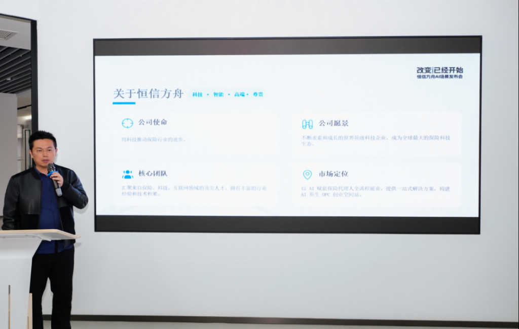在AI加速走向真实业务场景的背景下,恒信方舟总裁周青表示,恒信方舟正以“AI原生OPC创业空间站”为定位,为保险代理人展业提供AI一站式展业解决方案。