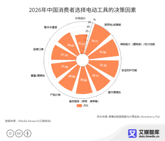 在消费者决策层面,耐用性/故障率(34.71%)、续航能力(32.90%)、安全防护功能(32.39%) 成为用户选择电动工具时最关注的三大因素;同时操作便捷性、售后服务与产品价格也占据较高权重。这意味着,品质可靠、性能稳定、安全易用的产品,将更易获得市场青睐,也为行业指明了技术与产品迭代的核心方向。