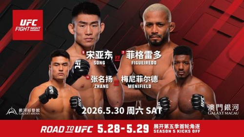 2026年3月31日 - 「澳門銀河」热烈宣布,万众瞩目的UFC格鬥之夜:宋亚东 vs. 菲格雷多及《UFC精英之路》第五季首轮赛事将于5月28-30日于澳门最大的室内综艺馆银河综艺馆正式上演,门票将于4月17日正式公开发售。而银河致尚小程序会员更可于4月14日起享有优先购票福利。《UFC格斗之夜澳门》门票更推出包括一系列专属礼遇的VIP套票,以及包含《UFC格斗之夜澳门》2026及《UFC精英之路》第五季首轮赛事之三日套票。门票开售,标志着「澳門銀河」与UFC为期四年的战略合作关系得以深化,双方将于本年至2029年期间在「澳門銀河」举办三场《UFC格斗之夜》赛事。本次赛事云集世界知名综合格斗(MMA)明星及后起之秀,阵容星光熠熠。