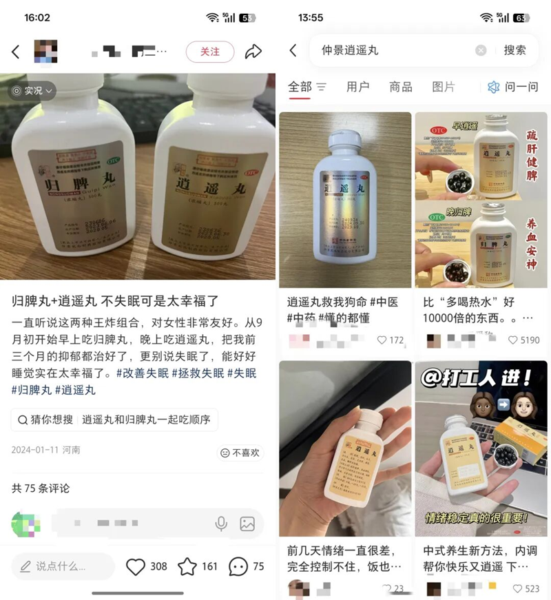 在小红书社交平台,仲景逍遥丸在逍遥丸品类常年占据第一的位置。“早逍遥晚归脾”的养生方案(即早起服用逍遥丸疏肝解郁一天好心情,晚上服用归脾丸养血安神助睡眠)也成为新的养生浪潮。